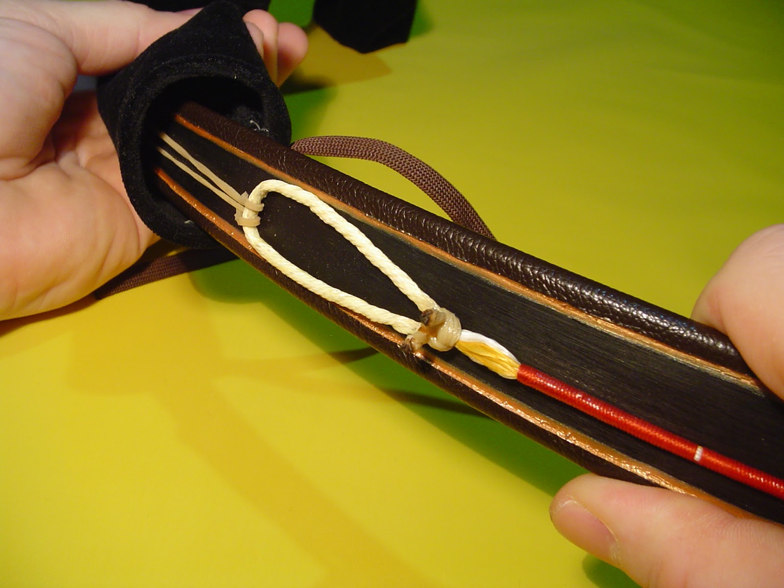 Gene kötü bir seçim yaptınız demektir ve bu seferde kirişin yayla beraber torbaya girmesi problem olacaktır.Bu şekilde belki Tonç düğümsüz kirişleri torbaya sokabilirsiniz ama bu şekilde torba içersine girmeleri gene problemlidir ve tutundukları lastiği çekeleyerek koparma ihtimalleri her zaman için vardır.Bu yöntemde ilk bakışta kullanışlı gibi görünse de kirişin sonradan yayı kirişleme maksadıyla yay başından çıkarılması zorunluluğu işi uzatmaktadır.Köprülü yaylara çıkarırken takılması,kirişin kasanları ve kenarları zamanla da aşındırması ise cabasıdır.Kısaca gene size göstereceğim yöntem kadar pratik değildir.